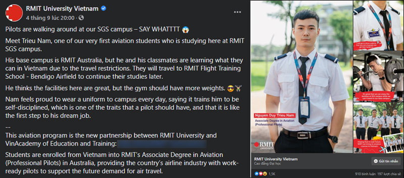 Theo lời mô tả của bài viết, thì Triệu Nam - nhân vật chính của chiếc post "ngon lành" này là một trong những sinh viên ngành hàng không đầu tiên đang học tại cơ sở RMIT TP.HCM. Tuy nhiên vì tình hình dịch COVID-19, nhiều hoạt động đành phải tạm ngừng, việc di chuyển đến Úc - nơi có trụ sở chính của chương trình đào tạo anh chàng và các bạn học, cũng chịu chung số phận.