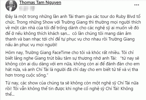 Chồng Hồng Ngọc viết: "Hôm nay, Trường Giang facetime cho tôi và khóc rất nhiều. Tôi chỉ biết lắng nghe Giang trút bầu tâm sự thương nhớ anh Tài: Từ nay sẽ không còn ai dịu dàng với em nữa, không còn ai để đánh đàn cho em hát nữa. Anh Chí Tài là người đã chỉ dạy cho em biết tử tế và vị tha hơn trong cuộc sống".