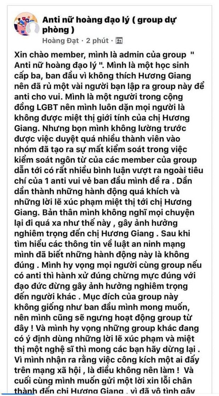 Trưởng group anti Hương Giang tuyên bố đóng cửa, lý do nghe vui quá