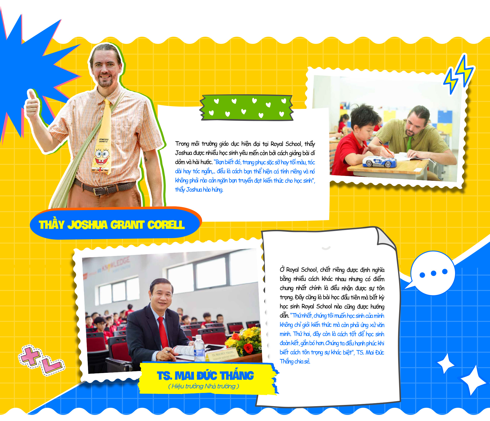 Tại Royal School, hình ảnh thầy Joshua Grant Correll, giáo viên tiếng Anh, đã không còn quá xa lạ. Mỗi ngày đến trường, thầy đều xuất hiện với trang phục sặc sỡ và chiếc cà vạt mới. Với đầy đủ màu sắc và hình thù dễ thương, những chiếc cà vạt đã trở thành "thương hiệu" của thầy Joshua.