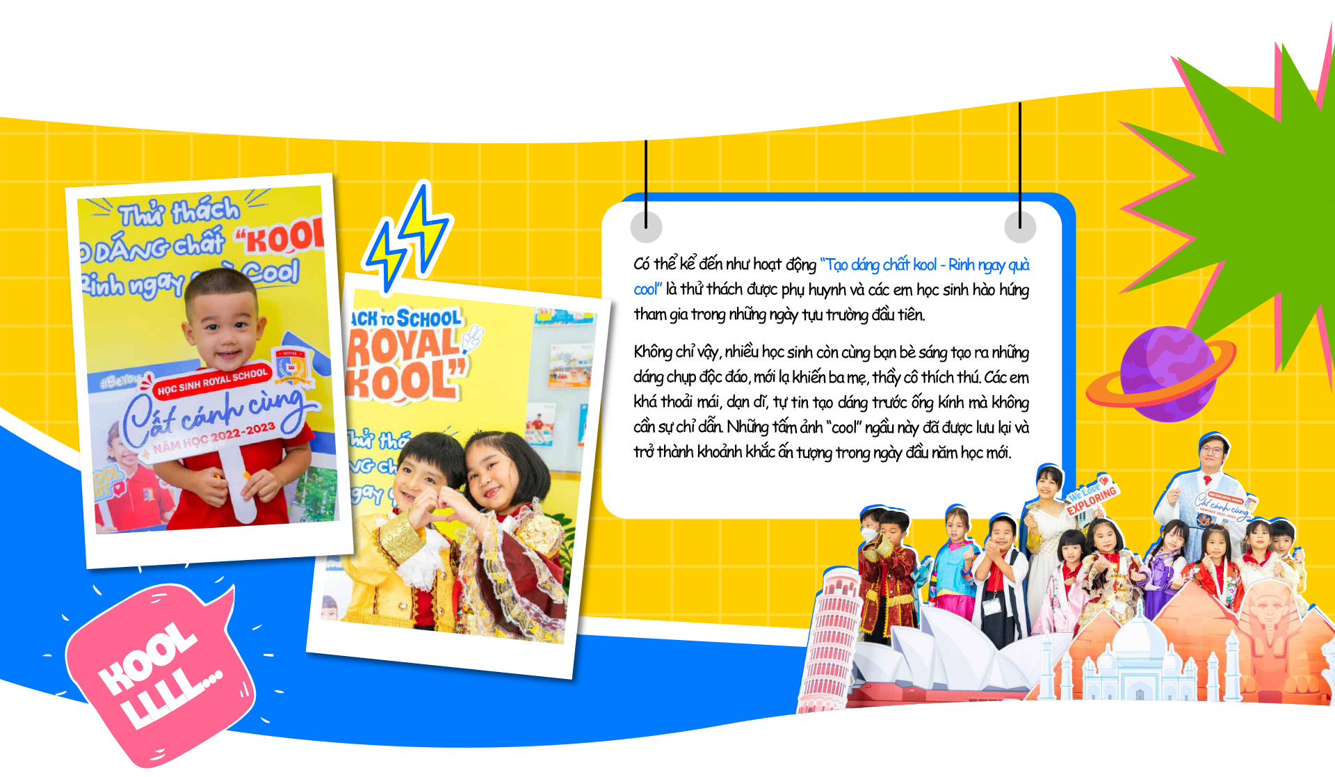 Mỗi ngày đến trường, các em học sinh vui vẻ và tự tin thể hiện bản thân, cá tính riêng, lan tỏa lối sống tích cực trong môi trường giáo dục. Trong chuỗi hoạt động chào đón năm học mới, Royal School triển khai chủ đề “Back To School - Royal Kool” với nhiều trải nghiệm thú vị.