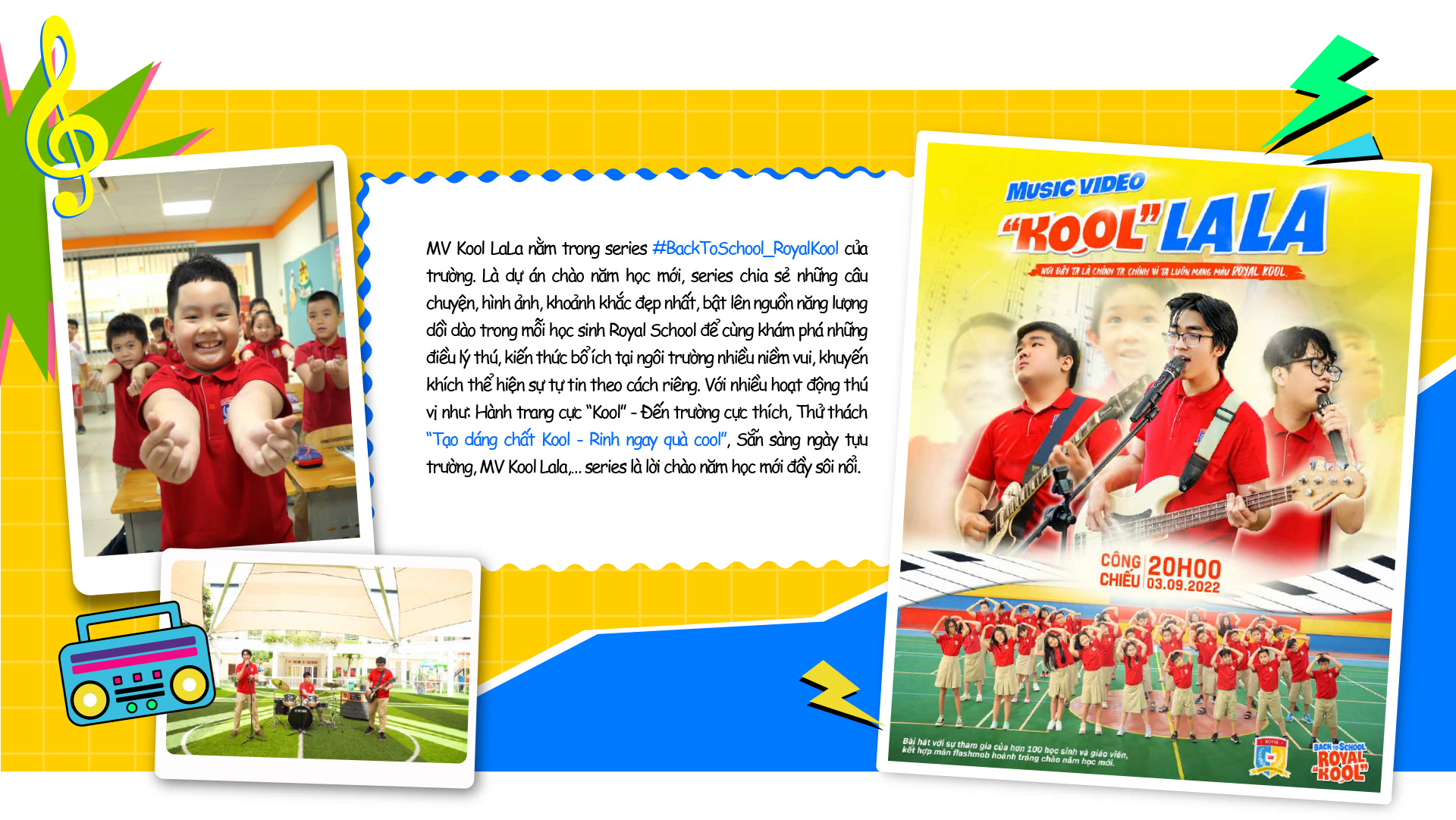 Ngoài ra, năm nay Royal School còn đầu tư "chơi lớn", quyết định chào đón năm mới với MV "Kool" LaLa. Với thông điệp "Hạnh phúc tại Royal School khởi nguồn từ môi trường tôn trọng sự khác biệt", sản phẩm cũng đánh dấu lần đầu tiên nhà trường kết hợp cùng học sinh thực hiện sản phẩm âm nhạc chuyên nghiệp.