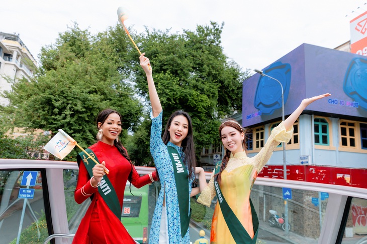 Trương Ngọc Ánh cùng 90 thí sinh Miss Earth 2023 diện trang phục áo dài truyền thống, thu hút sự chú ý trên đường phố Sài Gòn.