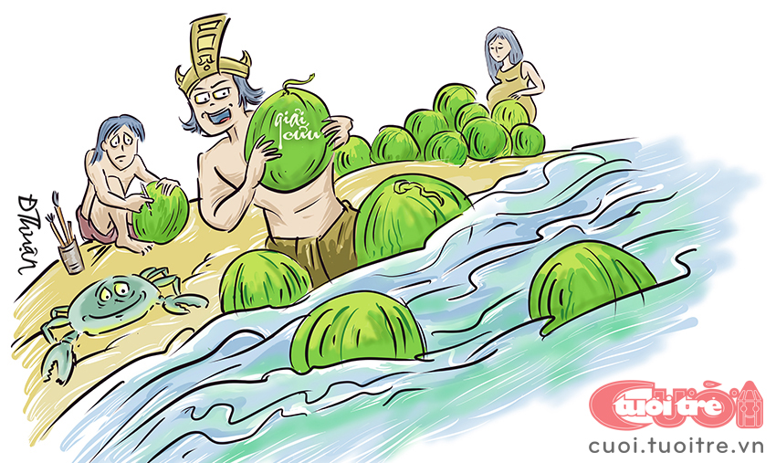 Chơi lắc bầu cua ăn dưa hấu riết rồi cũng ngán. Mai An Tiêm lại khóc :" Còn vài tháng nữa con ta ra đời. Tiền đâu đi Từ Dũ đây?". Thấy bạn khốn khổ Lạc Trôi bèn hiến kế: Hay là ta thử khắc dòng chữ "Hãy giải cứu dưa hấu giúp Mai An Tiêm" rồi thả dưa xuống biển xem sao? Ai dè người đất liền thích giải cứu quá, rủ cả trăm cả ngàn người chèo ghe, lội suối tìm về đảo của Mai An Tiêm thu mua sạch dưa hấu. Mai An Tiêm lên đời giàu sang từ đó. Hai vợ chồng họ Mai có điều kiện bèn rủ nhau về đất liền sinh sống để chờ ngày sinh con. Nhờ Lạc Trôi độ mà Mai An Tiêm thoát nghèo, chàng bèn để nửa gia tài lại cho Lạc Trôi và Cua sinh sống.