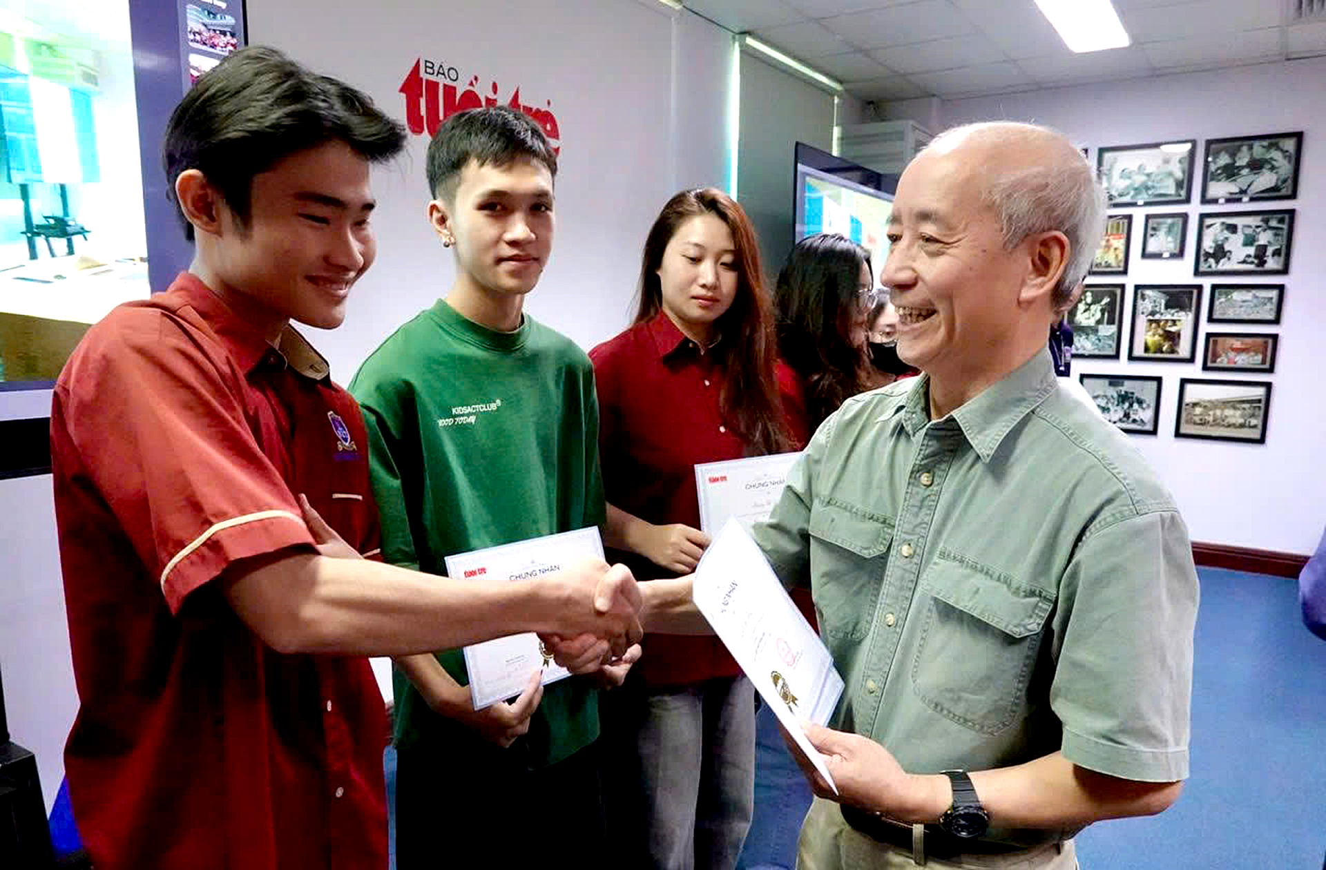 PGS.TS Vũ Quang Hào trao chứng nhận hoàn thành khóa học cho sinh viên. Các sinh viên sau khi hoàn thành học phần, đủ điều kiện đều được báo Tuổi Trẻ cấp giấy chứng nhận