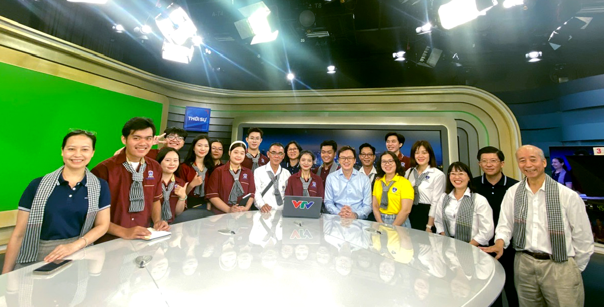 Thầy Vũ Quang Hào cùng các thầy cô và sinh viên Khoa Truyền thông sáng tạo tại trường quay S4, Đài Truyền hình Việt Nam. Chuyến đi do báo Tuổi Trẻ tài trợ, là phần thưởng cho các sinh viên có thành tích học tập xuất sắc trong chương trình hợp tác đào tạo giữa 2 đơn vị.