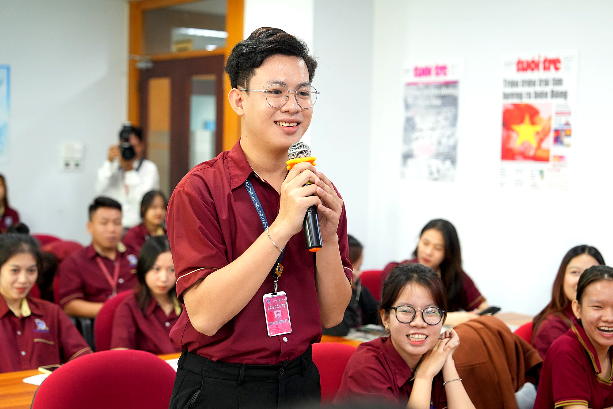 Sinh viên phát biểu và đặt câu hỏi tại lễ khai giảng chương trình hợp tác đào tạo giữa Trường đại học Nguyễn Tất Thành và báo Tuổi Trẻ