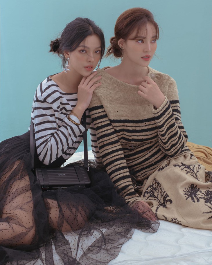 Như set đầu tiên, Tú Hảo và Ninh Dương Lan Ngọc đã chọn cho mình key item chung chính là sweater và chân váy. Tuy có phần khác biệt ở gam màu, cặp đôi vẫn có sự liên kết khi chọn cùng một họa tiết sọc ngang Breton cho phần top và sắc đen cho tổng thể thích hợp cho cô nàng công sở hay một buổi chiều dạo phố cuối tuần cùng bạn bè. Đấy là chưa nói đến cả hai mỹ nhân đều phô diễn hoàn hảo những dáng pose và góc mặt tương tác rất tốt, không bị rời rạc.