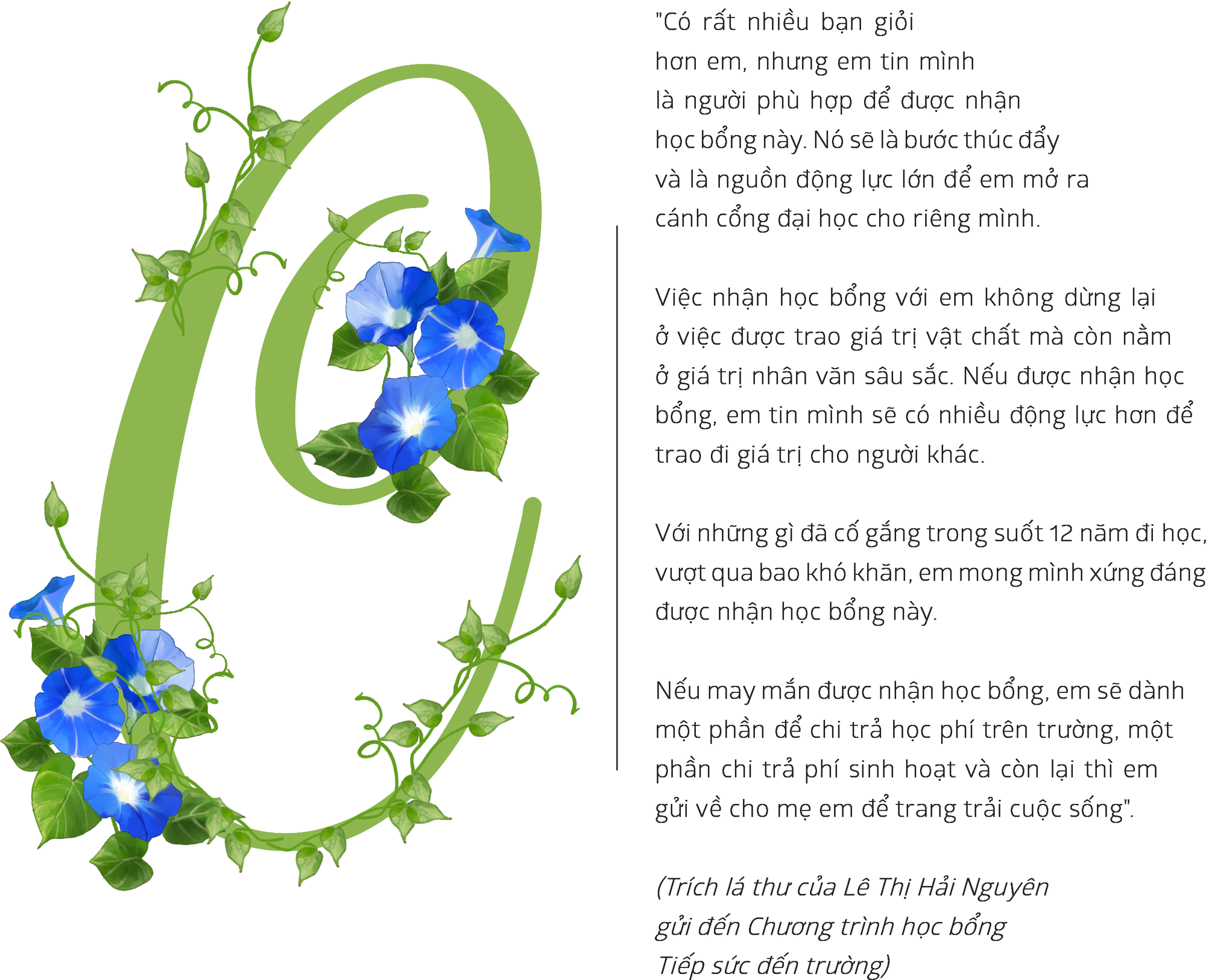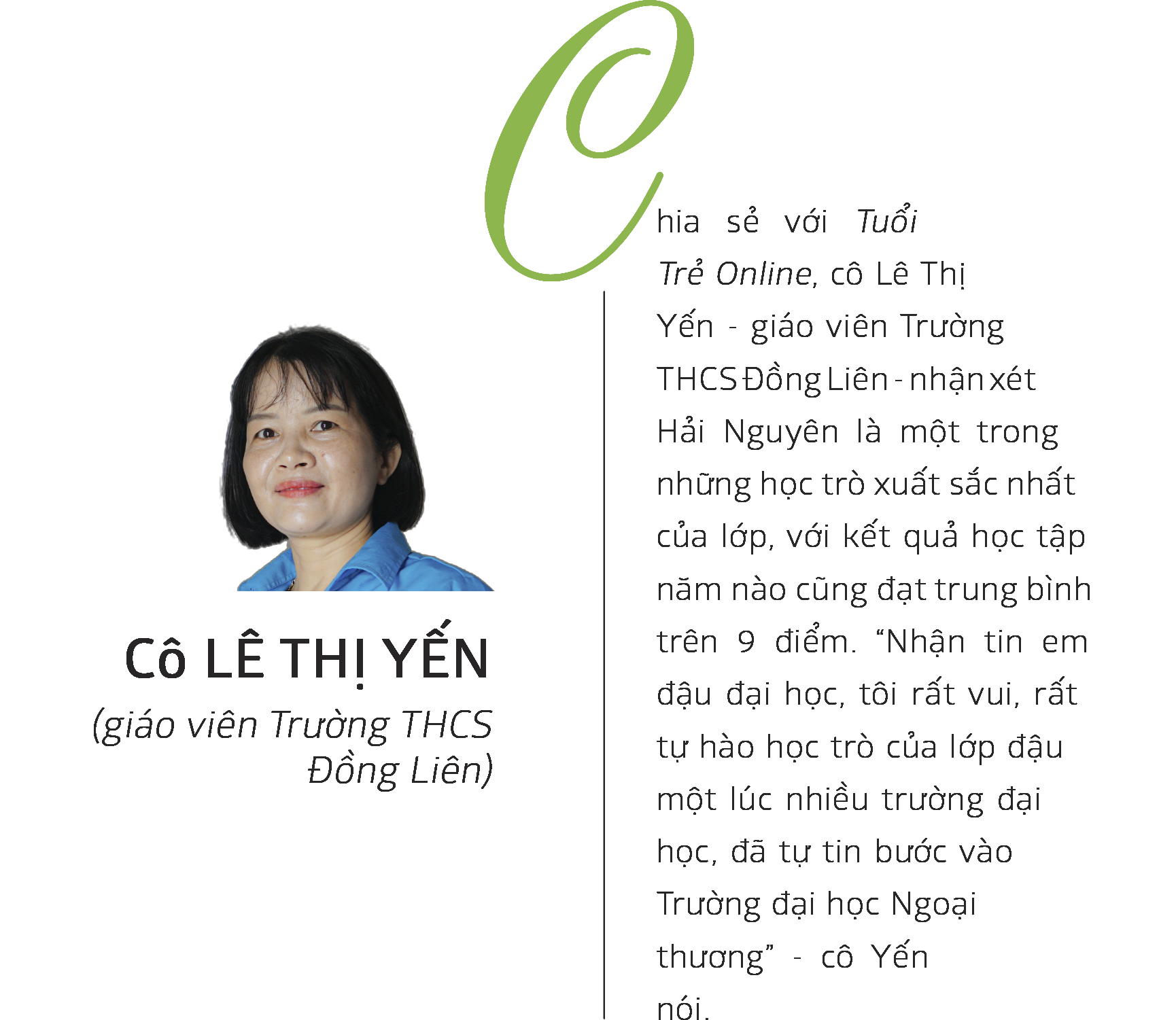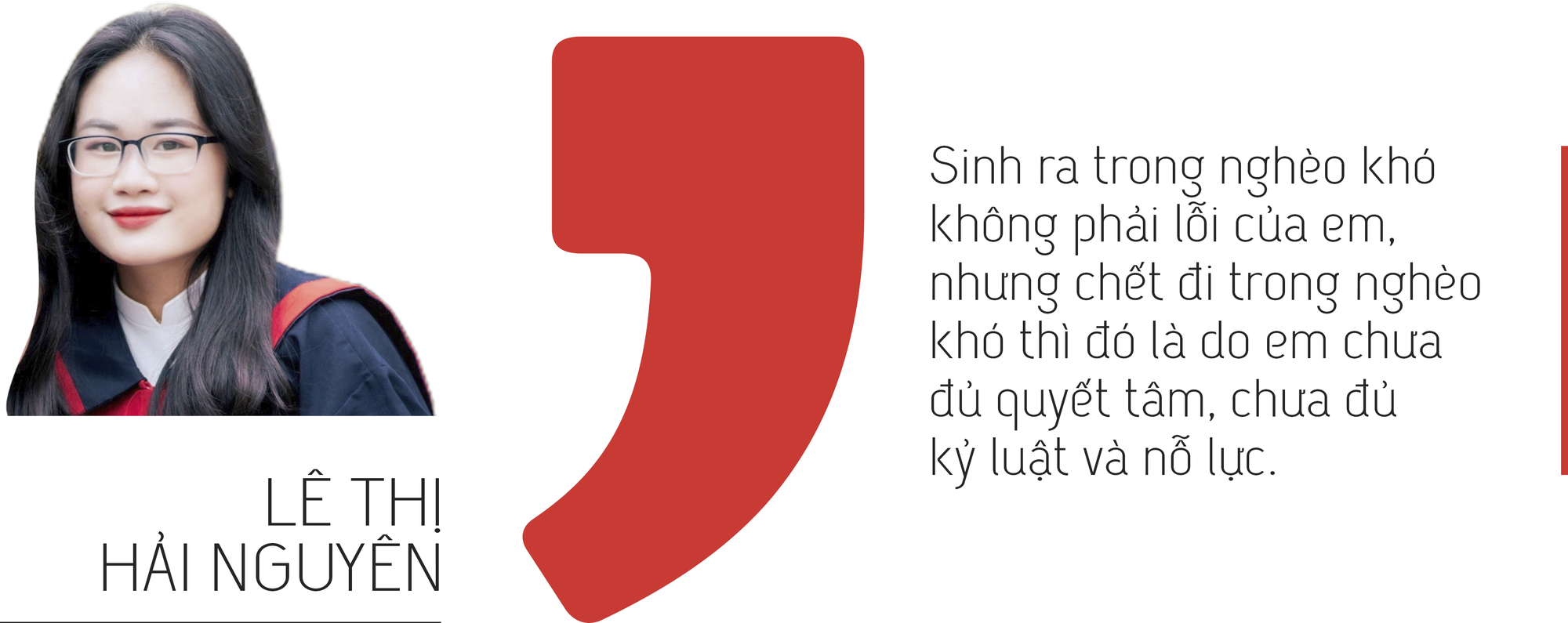 "Con hứa với mẹ sẽ học thật tốt và trở thành một người tử tế, tử tế với chính bản thân, tử tế với mẹ và tử tế với mọi người xung quanh nữa. Từ bé đến giờ con luôn nhận được sự giúp đỡ của mọi người, vì thế mẹ luôn mong con sau này lớn lên sẽ giúp đỡ người khác. Con hứa sẽ trở thành người như vậy" - Lê Thị Hải Nguyên tâm niệm.
