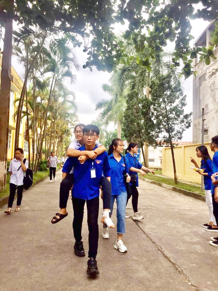 Trong kỳ thi tuyển sinh vào lớp 10, Hải Nguyên được anh chị tình nguyện viên cõng vào phòng thi do chân không đi lại được