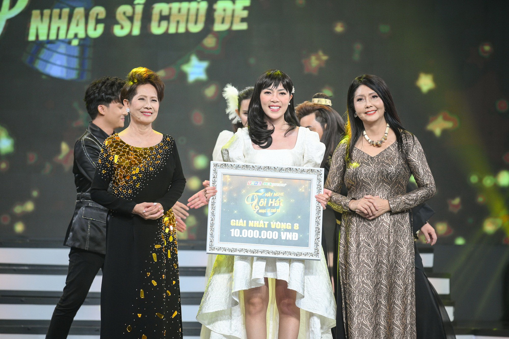 Phương Dung (trái) và Họa Mi (phải) trao giải nhất vòng 8 cho thí sinh Tuyết Mai. Đêm thi cuối cùng của 3 vòng bán kết vừa kết thúc tối 28-5 với Top 3 tiến vào vòng chung kết là: Tuyết Mai, Trương Diễm và Đăng Nguyên.