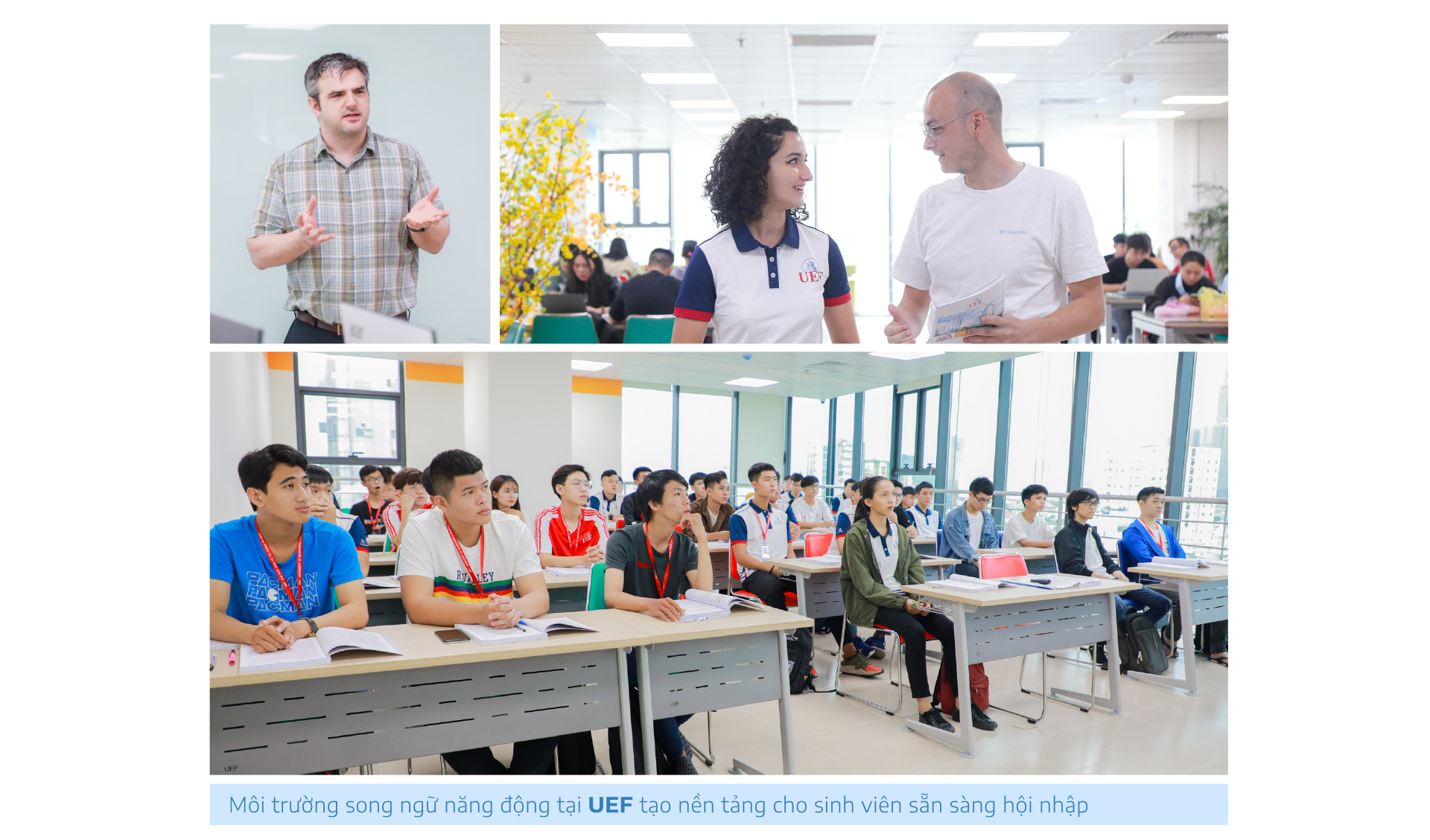 Với chương trình song ngữ, tiếng Anh chiếm 50% thời lượng học tập của sinh viên UEF. Tại đây, ngoại ngữ không chỉ là một môn học, mà là một phần cuộc sống sinh viên, một công cụ mở ra cơ hội và kết nối với thế giới xung quanh.