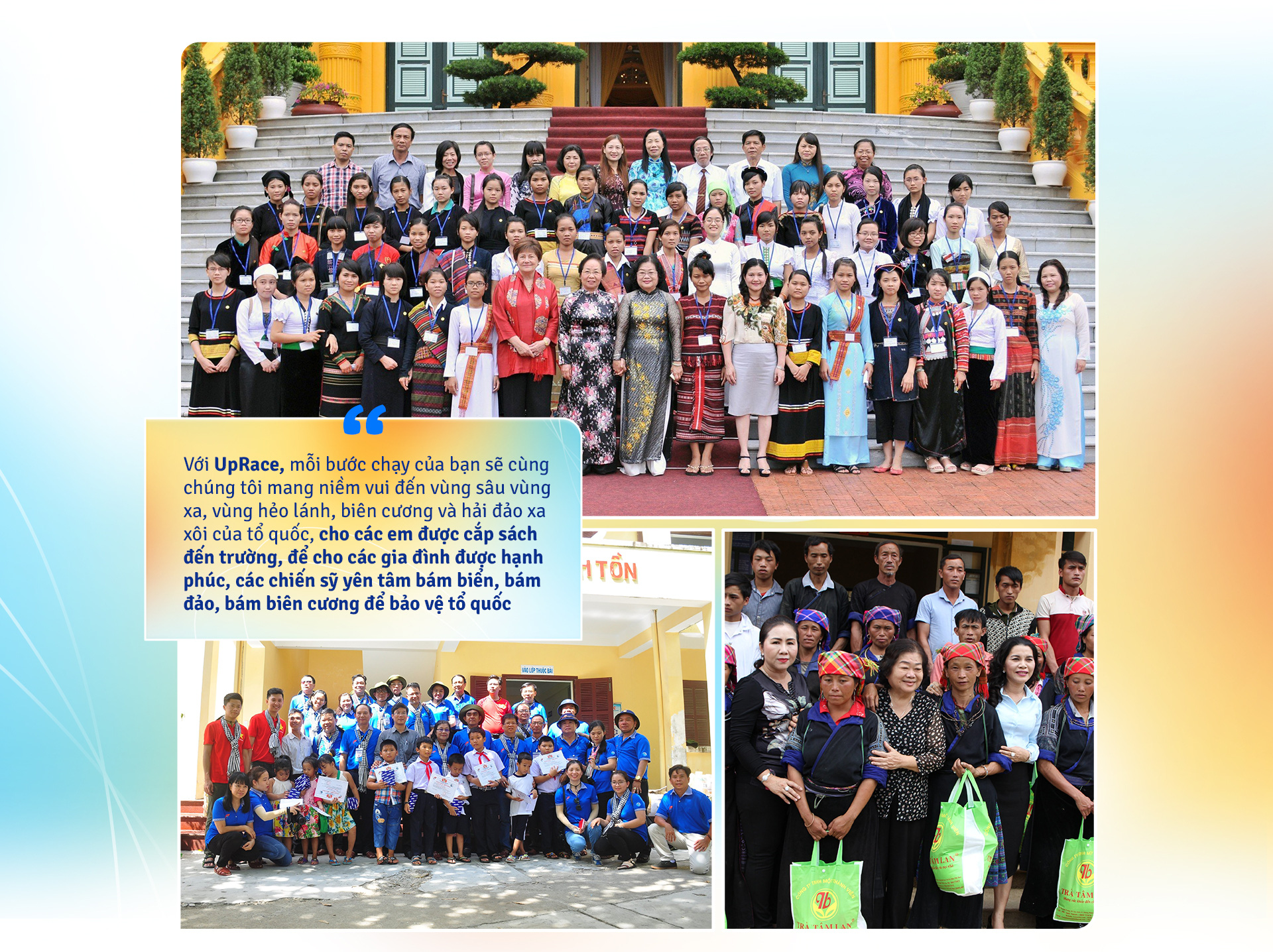 "Với UpRace, mỗi bước chạy của bạn sẽ cùng chúng tôi mang niềm vui đến vùng sâu vùng xa, vùng hẻo lánh, biên cương và hải đảo xa xôi của Tổ quốc, cho các em được cắp sách đến trường, để cho các gia đình được hạnh phúc, các chiến sĩ yên tâm bám biển, bám đảo, bám biên cương để bảo vệ Tổ quốc", bà Trương Mỹ Hoa, nguyên Phó chủ tịch nước, chủ tịch Quỹ học bổng Vừ A Dính, chia sẻ.