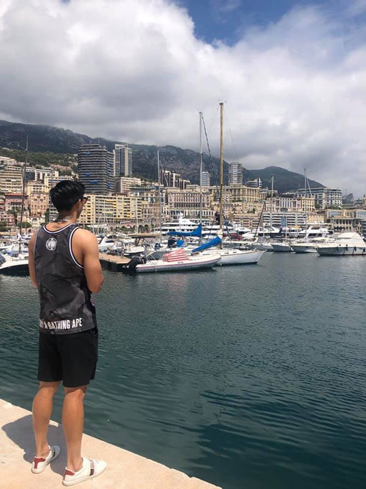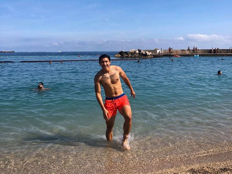 Văn Hậu "khoe" cơ bắp và hình xăm trên bãi biển ở Monaco. (Ảnh: FBNV)