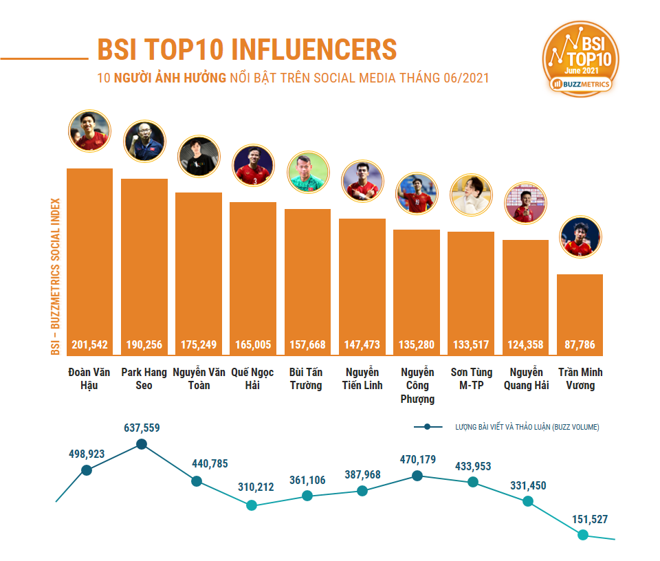 Kết quả thống kê từ Buzzmatrics cho biết, trong tháng 6/2021, 9 trên 10 cái tên có ảnh hưởng nhất trên mạng xã hội là thành viên đội tuyển quốc gia Việt Nam. Người duy nhất không là thành viên của ĐTQG Việt Nam chính là ca sĩ Sơn Tùng-MTP.
