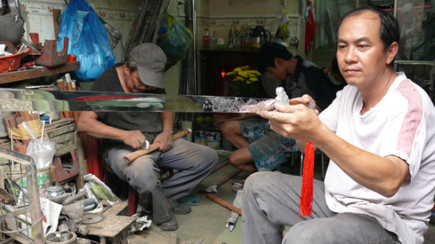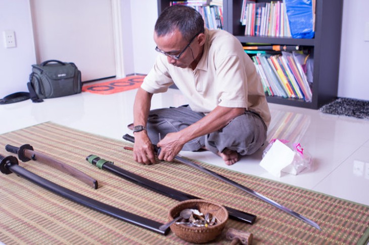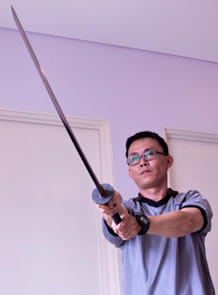 TTCT - Những người tập luyện võ thuật ở TP.HCM, đặc biệt là các môn võ Nhật Bản, có nhu cầu tìm mua dụng cụ tập luyện như kiếm gỗ (bokken), gậy gỗ (jo), kiếm thép (katana) có thể hài lòng với sản phẩm “made in Vietnam” của những người thợ đam mê với nghề, trong số đó có thể nhắc đến anh Trần Nguyễn Phi Vũ và kiến trúc sư Hoàng Phùng Võ. Anh Phi Vũ trong xưởng sản xuất dụng cụ tập luyện ở quận 4 - Ảnh: Minh DũngNhững năm 1980, kể từ khi các môn phái võ thuật được phép hoạt động trở lại, một số võ sư có điều kiện đi nước ngoài hoặc có mối quan hệ với các võ sư Nhật Bản đã nhờ mua hoặc được tặng các loại dụng cụ tập luyện nói trên đã đem các vật phẩm này về thuê thợ mộc, thợ sắt có tay nghề làm lại để các môn sinh có dụng cụ tập luyện. Theo thời gian, nghề sản xuất dụng cụ tập luyện phát triển theo các môn võ.Trong số các lò sản xuất dụng cụ tập luyện võ thuật tại TP.HCM, lò của anh Trần Nguyễn Phi Vũ trong con hẻm nhỏ ở quận 4 là một trong số ít địa chỉ tin cậy. Học nghề từ dượng rể, người chuyên chế tác các loại binh khí cho các đoàn hát cải lương tuồng cổ và các lò võ cổ truyền, anh Vũ tiếp nối công việc sau khi người dượng rể qua đời và phát triển thành “Cơ sở gia công dụng cụ luyện tập võ thuật Phi Vũ” hiện nay.Giấc mơ katanaVới 22 năm trong nghề, hiện anh Vũ có thể chế tác được tất cả các loại binh khí của “thập bát ban võ nghệ” theo đúng yêu cầu của võ sư các môn. Anh “khoe” thêm rằng kể từ khi bộ môn vovinam phát triển thành Liên đoàn Vovinam thế giới, anh liên tục nhận đơn hàng xuất khẩu sản phẩm. Tuy nhiên, sản phẩm thách thức tay nghề anh nhiều nhất chính là kiếm Nhật.Anh Vũ tiếp cận và chế tác các loại kiếm Nhật từ năm 1998, từ kiếm gỗ (bokken) tới kiếm thép (katana) theo yêu cầu của một ông thầy dạy aikido cùng một tập tài liệu mỏng. Với anh, katana đòi hỏi tay nghề rất cao về nhiều mặt: rèn, trui, mài, bao kiếm...Anh Vũ làm được rất nhiều cây bokken, nhưng đến nay mới làm được khoảng 30 cây katana và thừa nhận chỉ tiếp cận cái “vỏ” ngoài của nó mà thôi. Anh rất muốn làm được một cây katana hoàn chỉnh như là sản phẩm nghệ thuật cao cấp, chứ không phải là “bản sao chép không hoàn chỉnh” hiện nay. Đó là một đam mê và cũng là thử thách đời làm kiếm của anh. “Tôi sẽ cố gắng làm được một cái gì đó ghi dấu ấn nghề nghiệp cho riêng mình” - anh tâm sự.Các sản phẩm của Nhật Bản nói chung và các sản phẩm làm bằng tay nói riêng hầu như đều đạt đến độ tinh xảo đáng kinh ngạc. Đặc biệt với cây kiếm Nhật, nó không chỉ nổi tiếng trên toàn thế giới về độ bén và độ bền của thép, mà còn thể hiện tinh thần văn hóa Nhật, một sản phẩm nghệ thuật đích thực. Do vậy, rất nhiều người muốn sở hữu “tác phẩm nghệ thuật” này để thỏa niềm yêu thích của mình.Tuy nhiên, katana thứ thiệt rất đắt. Tùy theo tên tuổi của người làm mà nó có giá nhiều ngàn đôla Mỹ, thậm chí một katana năm 1845 đã có giá 500.000 euro (theo ông Karl-Heinz Peuker - một người Đức sưu tầm và mua bán kiếm Nhật).Trong số người yêu thích văn hóa Nhật và đam mê katana vì dáng vẻ thanh thoát, nghệ thuật tối giản, cùng với những thách thức ẩn chứa trong việc rèn kiếm, có một người muốn hiện thực hóa đam mê của mình dù không có nhiều tiền.Kiến trúc sư Hoàng Phùng Võ thử kiếm - Ảnh: Minh DũngMất bảy năm cho nhát búa đầu tiênNếu anh Vũ đam mê và sản xuất kiếm theo kiểu thị trường thì kiến trúc sư Hoàng Phùng Võ mê theo kiểu khác. “Ba tôi mê nghề cơ khí và rất khéo tay. Ở nhà có một xưởng cơ khí nhỏ nên tôi hay luẩn quẩn chơi ở đó từ bé, làm quen với các dụng cụ cơ khí của ông già. Có lẽ có chút ít gen di truyền này mà tôi khá khéo tay. Đặc biệt tôi rất có năng khiếu với những gì liên quan đến hình ảnh và chuyển động” - kiến trúc sư Võ vui vẻ cho biết.Từ nhỏ, Võ rất ghét võ thuật nhưng lại thích nghiên cứu về sự vận động của con người, về sự phối hợp cơ, gân, xương... “Tôi mê sự hợp lý. Tôi tìm thấy điều ấy qua văn hóa và kiếm Nhật” - anh Võ giải thích.Theo anh, katana có hình dáng khí động học chuẩn mực, từ góc mài, độ vát, độ cong, độ xước, chiều dài kiếm... đều phù hợp với sự vận động của cơ thể con người. Võ cũng mê sự tối giản và tinh xảo trong cách rèn và mài kiếm. Từ nguồn thông tin trên Internet, anh đã tiếp cận khá sâu về những điều kiện để có thể rèn được một cây katana cho riêng mình.Nhưng khi bắt tay vào thực tế, Võ mới thấy không suôn sẻ như anh nghĩ. Tính từ lúc quyết tâm làm katana đến lúc đập nhát búa đầu tiên trên thanh thép trui từ lò rèn tự làm, anh mất gần bảy năm. Ngoài giờ làm việc, cứ rảnh là anh lang thang từ chợ thép Hà Tôn Quyền, Lý Nam Đế (Q.5) để tìm nguồn thép, đồng tốt; ch