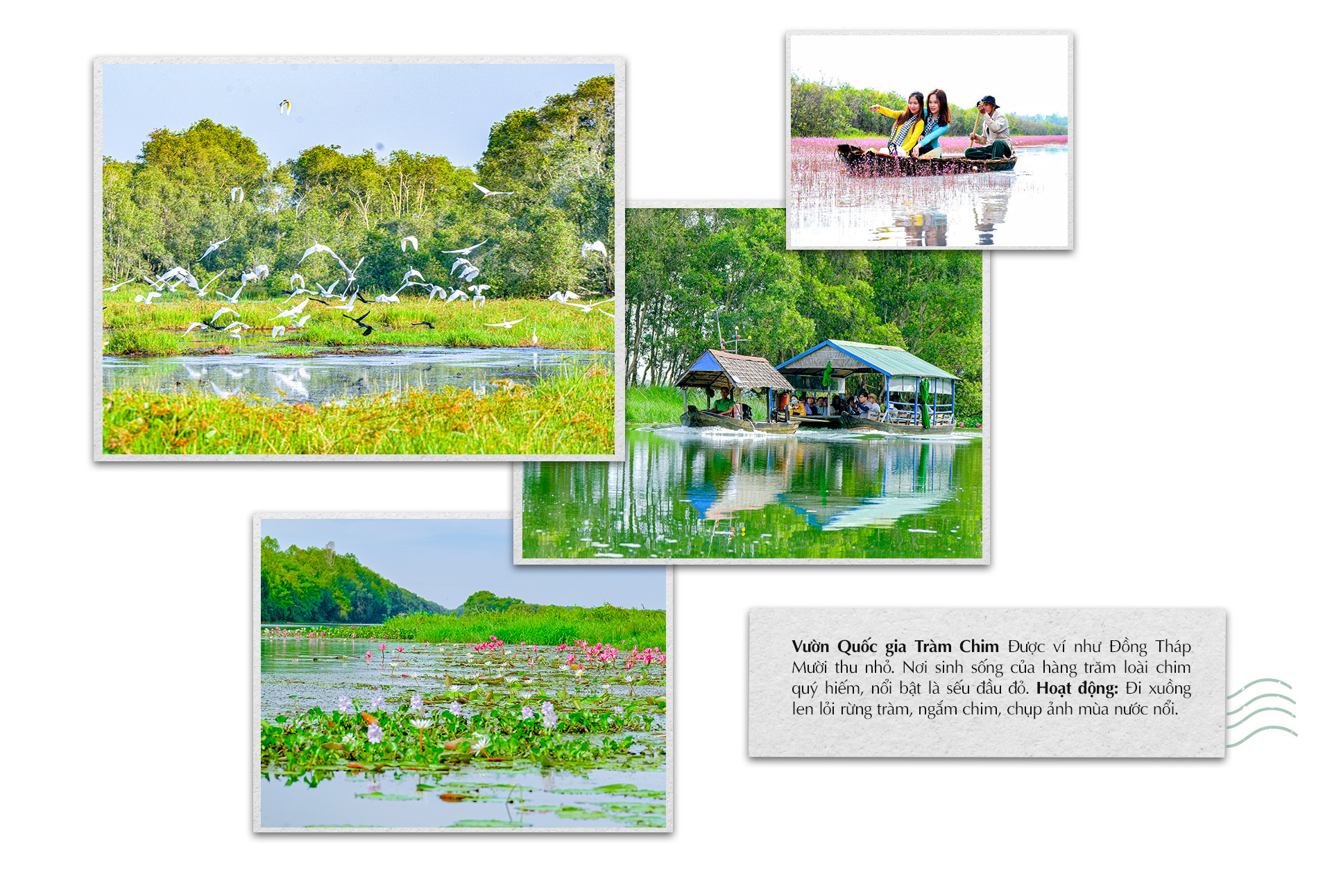 Ngoài các điểm tiêu biểu trên, Đồng Tháp còn nổi tiếng với các khu du lịch mới, farmstay, homestay sinh thái… phục vụ du khách trải nghiệm "làm nông dân", câu cá, bắt chuột đồng, hái sen, thưởng thức ẩm thực dân dã.