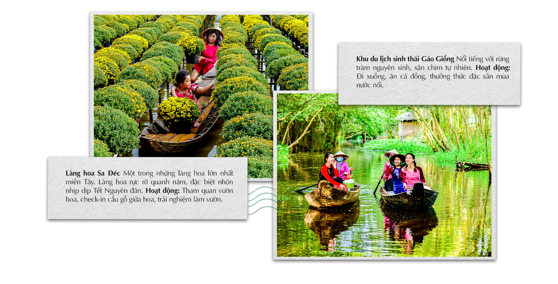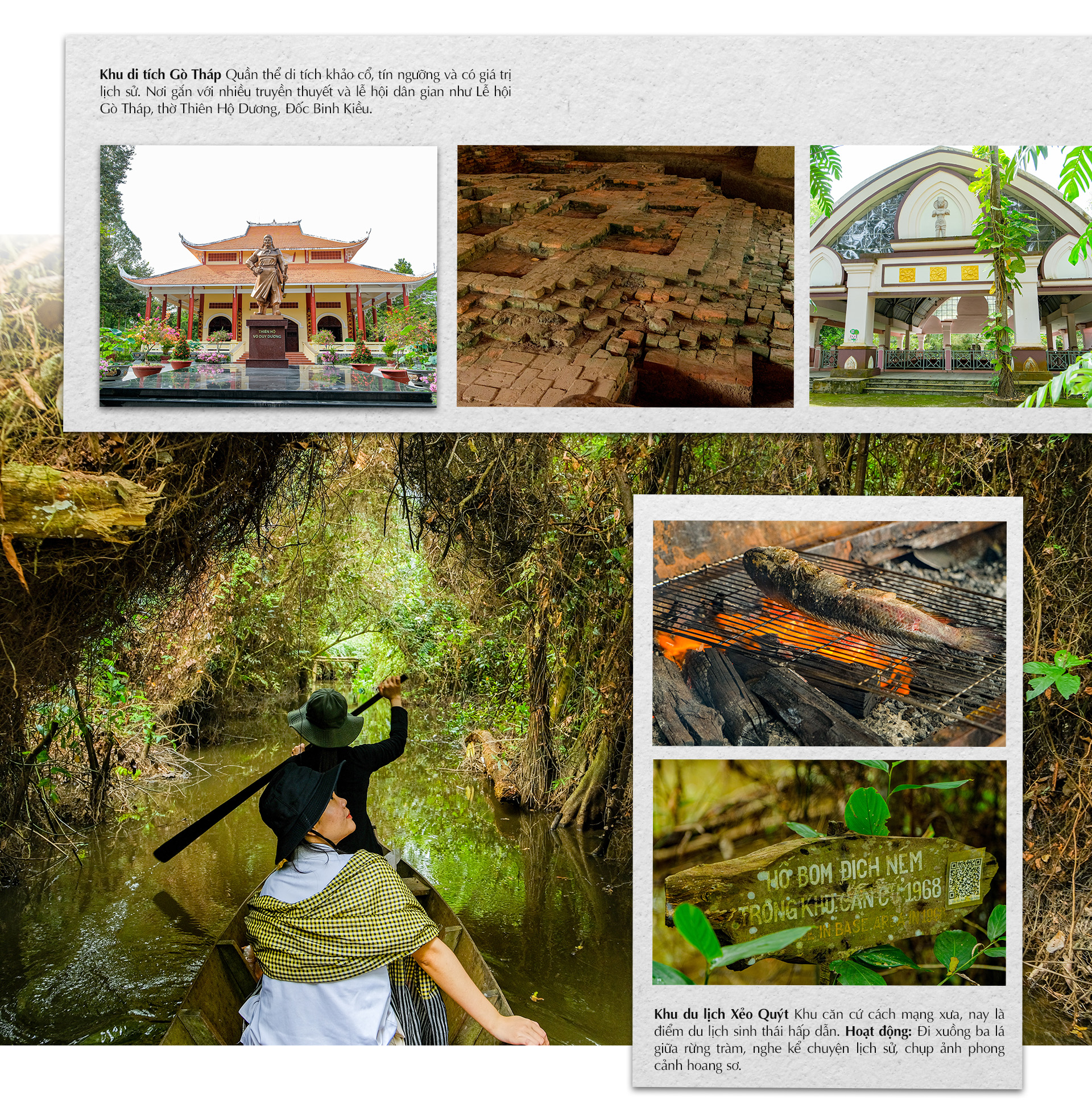 Hình thành các cụm du lịch: Sa Đéc (làng hoa, làng nghề truyền thống); cụm Tràm Chim - Tam Nông (du lịch sinh thái, quan sát chim, trải nghiệm mùa nước nổi); cụm Gò Tháp - Di tích văn hóa Óc Eo (du lịch tâm linh, khảo cổ, lễ hội).