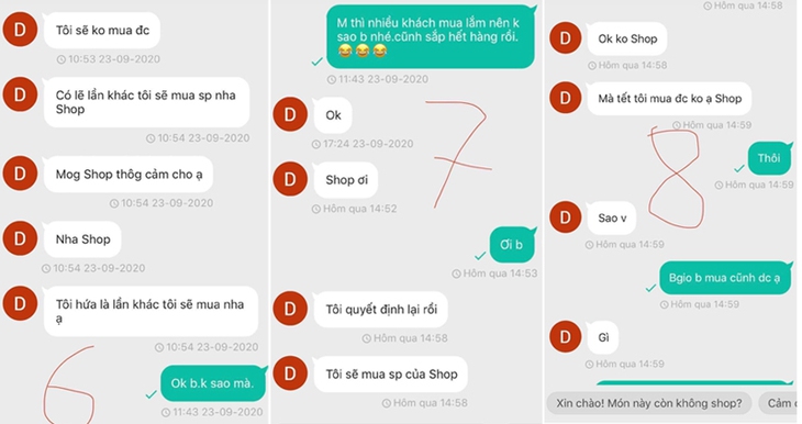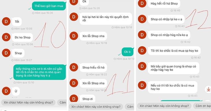 Điều đáng chú ý là sự lầy lội đến mức cực đỉnh của vị khách trên, đặt mua cho đã rồi hẹn đến tận "mùa xuân năm sau" cả 5 lần 7 lượt sẽ "chốt đơn", nhưng sau tất cả, lời hứa vẫn mãi là những dòng chữ vô hồn trên màn hình máy tính. Chủ shop vừa phải mang... cục tức khi chẳng bán được món hàng nào mà còn phải giữ gìn danh dự cho tiệm khi không thể nói bất kỳ lời nặng nhẹ nào, vẫn bình tĩnh cư xử đúng mực.