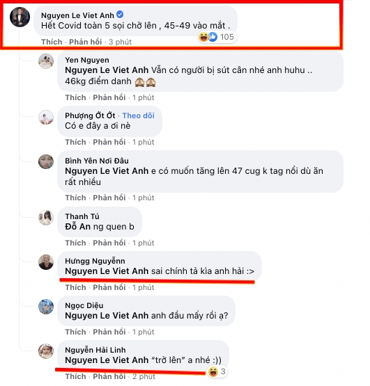 Chẳng rõ nam diễn viên vô tình "mắc lỗi chính tả" hay cố ý để tạo sự hài hước nhưng netizen vẫn nhiệt tình vào nhắc nhở ngay sau đó. Chỉ vài phút, bình luận của Việt Anh trở nên nổi bật gây chú ý với các cư dân mạng.