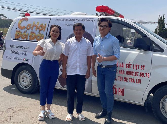 Ông Đoàn Ngọc Hải (giữa) bên chiếc xe cứu thương mới mua từ số tiền 1,7 tỉ đồng do nghệ sĩ Việt Hương (trái) tặngTrước đó, nguyên Phó chủ tịch UBND Q.1 (TP HCM) đã hào hứng chia sẻ rằng đây là một trong những cơ hội giúp ông có thêm tiền cho nguồn quỹ từ thiện, vì một “bữa cơm có thịt” cho các em học sinh vùng cao.