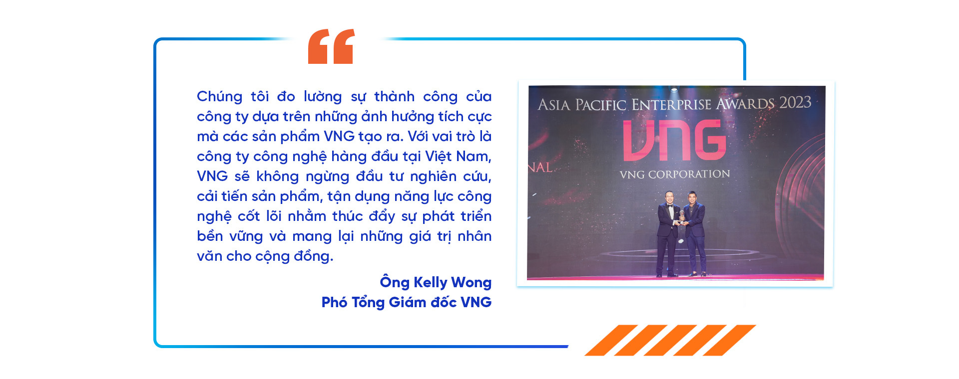 Minh chứng cho những nỗ lực trên, VNG được vinh danh trong hạng mục "Thương hiệu truyền cảm hứng - Inspirational Brand Award" tại Lễ trao giải Doanh nghiệp châu Á Thái Bình Dương - Asia Pacific Enterprise Awards 2023 (APEA 2023).