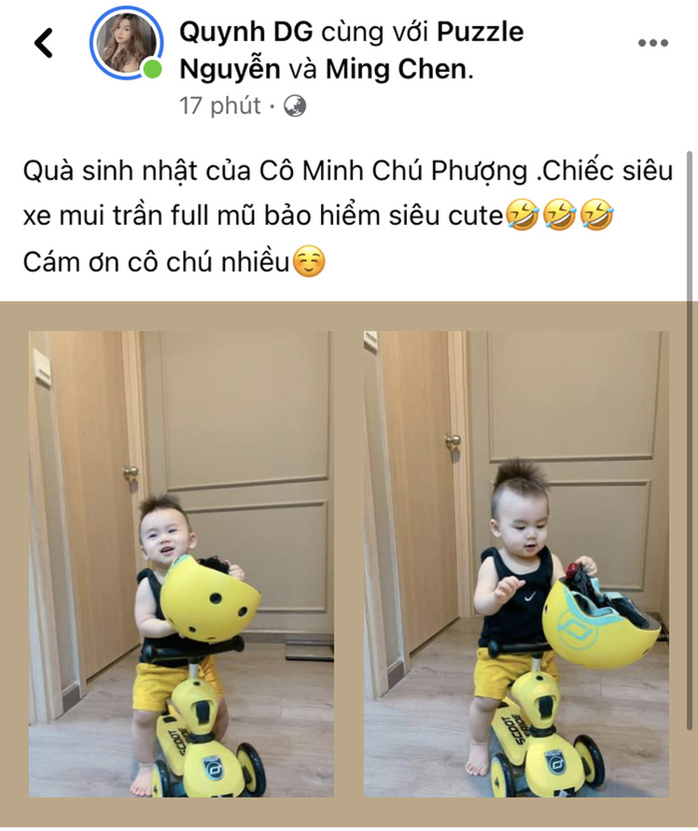 Trên trang cá nhân, vợ của tiền vệ Võ Huy Toàn đã tiết lộ việc vợ chồng Công Phượng gửi tặng cho con trai của cô một chiếc xe scooter mừng sinh nhật 1 tuổi.
