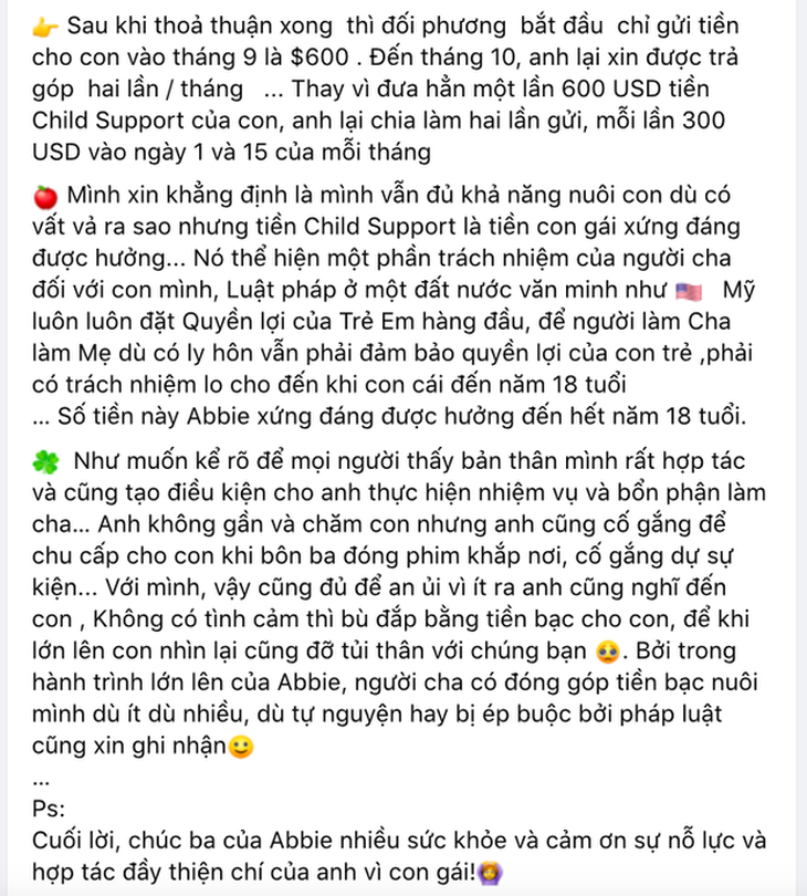 Bên cạnh đó, cô đánh giá cao thái độ và sự nỗ lực của Hoàng Anh. Dù không thể ở gần con gái nhưng việc anh chăm chỉ đóng phim, làm nhiều việc khác nhau để kiếm tiền cũng là một sự an ủi với bé Abbie. Cô cũng gởi lời chúc tới chồng cũ: "Chúc ba của Abbie nhiều sức khoẻ và cảm ơn sự nỗ lực và hợp tác đầy thiện chí của anh vì con gái”.