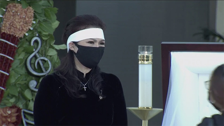 Cô ôm trong tay di ảnh chồng, thực hiện nghi thức cầu nguyện cho chồng được an nghỉ nơi chín suối. Dù rất đau thương nhưng "Bé Heo" của cố danh hài Chí Tài đã cố nén đau thương để lo chu toàn cho tang lễ chồng.