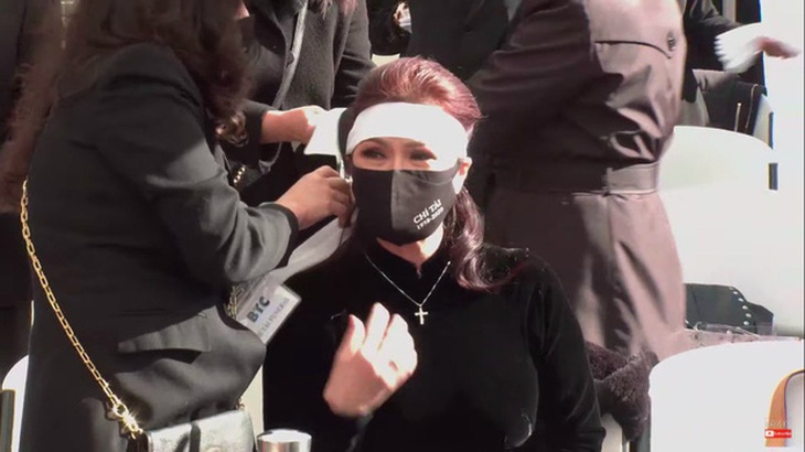 Bà xã Chí Tài đi theo xe chở linh cữu chồng tới nhà thờ Giáo xứ Thánh Linh - nơi diễn ra tang lễ từ sớm. Dù đã bịt khẩu trang nhưng cô vẫn không giấu được đôi mắt sưng húp vì khóc quá nhiều.