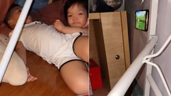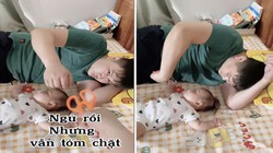 Vợ mang con vào bếp vừa trông vừa nấu ăn