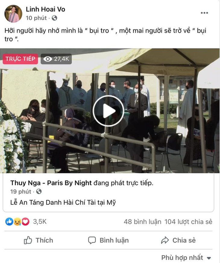 Tại Việt Nam, nghệ sĩ Hoài Linh cũng dõi theo tang lễ của cố danh hài Chí Tài ở Mỹ suốt 2 ngày qua. Vào 1h10 phút sáng 20-12 (giờ Việt Nam), nghệ sĩ Hoài Linh đã chia sẻ đoạn livestream tang lễ người tri kỷ ở Mỹ để khán giả trong nước được dõi theo.