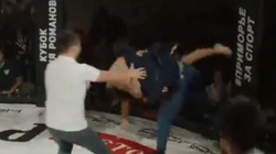 Giả vờ bắt tay rồi tung đòn đánh lén, võ sĩ quần trắng bất ngờ bị đối thủ đấm không trượt phát nào.