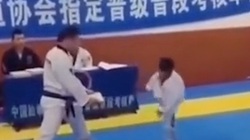 Sau khi bị dính đòn liên tiếp từ đối thủ, võ sĩ nhí bất ngờ dùng tuyệt kỹ 'lăng ba vi bộ' bỏ trốn khiến trọng tài và khán giả phì cười.