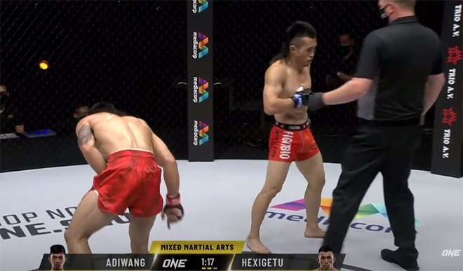 Hexigetu (phải) dùng thủ đoạn hạ lưu trong trận đấu.Adiwang được đánh giá cao hơn đối thủ và thực tế khi bắt đầu trận đấu, võ sĩ 28 tuổi đã áp đảo Hexigetu. Võ sĩ 36 tuổi Trung Quốc thậm chí phải bỏ chạy thoát thân.