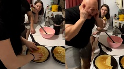 Thấy chồng đi làm về, người vợ vội trốn sau rèm cửa để hù chồng giật mình khiến nhiều người xem thích thú.