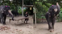 Sau khi được tài xế máy xúc giúp đỡ leo lên khỏi hố sâu, chú voi đã quay lại đùa giỡn như muốn nói lời cảm ơn.