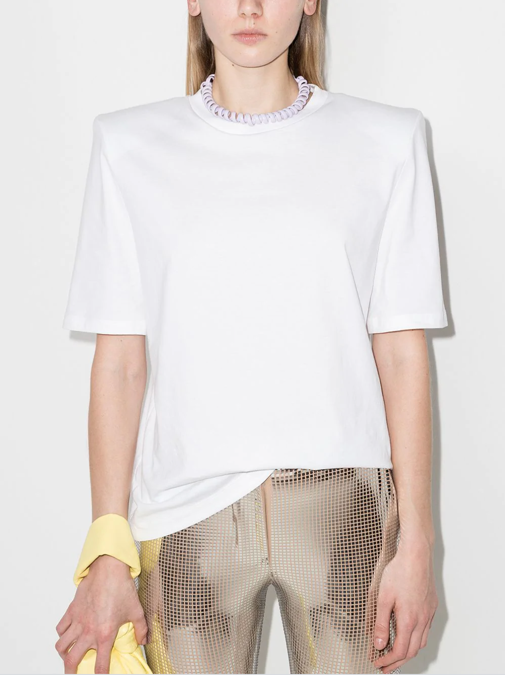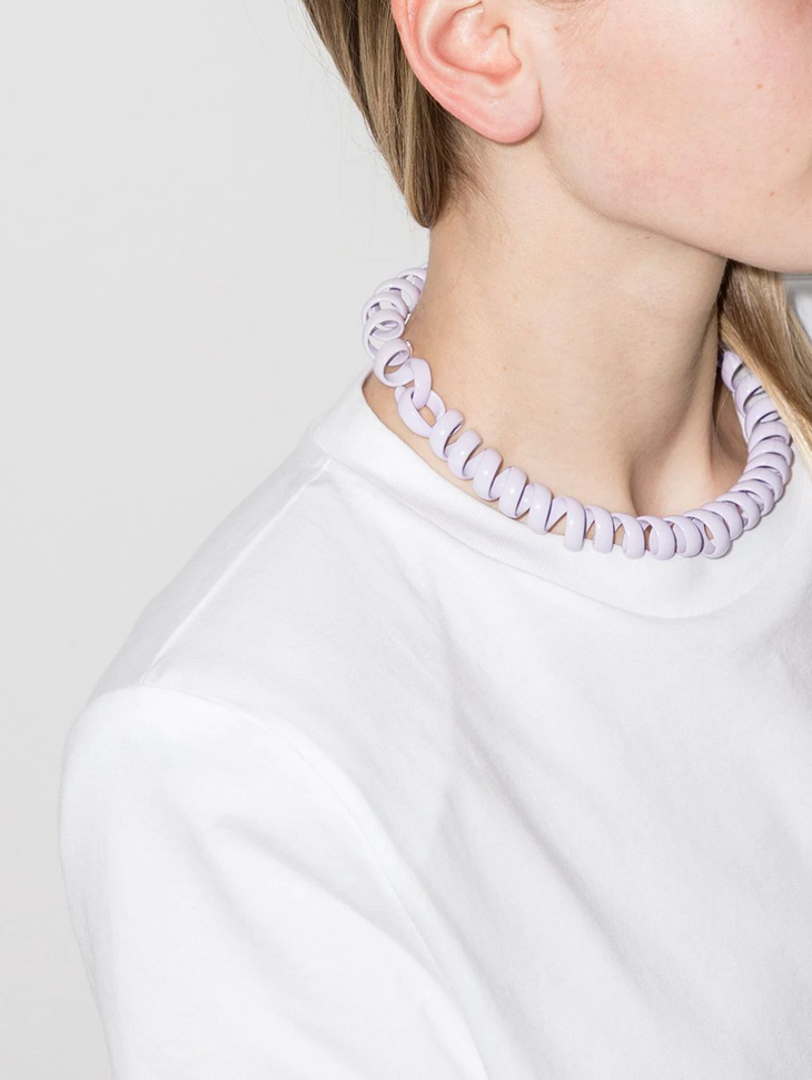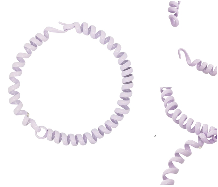 Khi phối lên người mẫu, chiếc choker sẽ giống chiếc dây điện thoại bàn bị giật đứt và đeo quanh cổ.Theo lời quảng cáo "có cánh" từ thương hiệu trên, chiếc vòng có tông màu tím oải hương này có khả năng đàn hồi và tạo điểm nhấn phong cách khi lựa chọn. Nó được làm từ 60% kim loại bạc và 40% nhựa tự nhiên, được tổng hợp từ nhiều loại cây khác nhau.