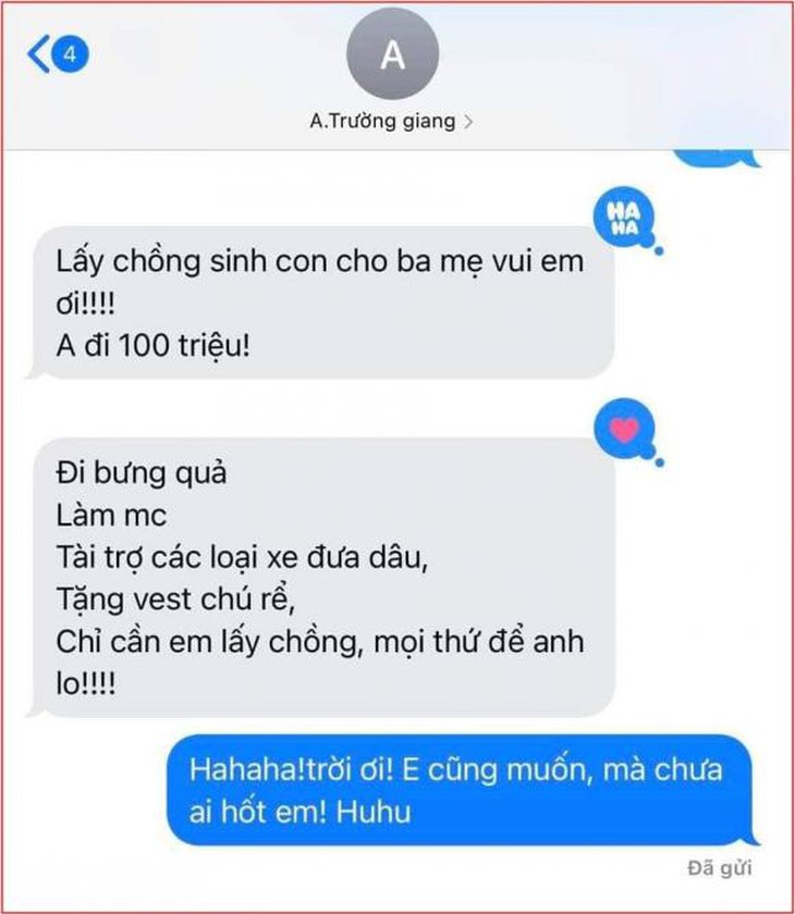 Có ai ngờ, Khả Như đã chụp đoạn tin nhắn này giữa mình và Trường Giang và chia sẻ ngay trên mạng xã hội: "Anh tôi! Nhắn nhủ đọc mà muốn quỵ. Ổng gặp là ổng nhai như nhai ngãi. Thấy không thấm, nay ổng khuyến mãi luôn rồi. Nhã Phương ơi, ổng hối lấy chồng, mà không chỉ cách làm sao cho có bồ".