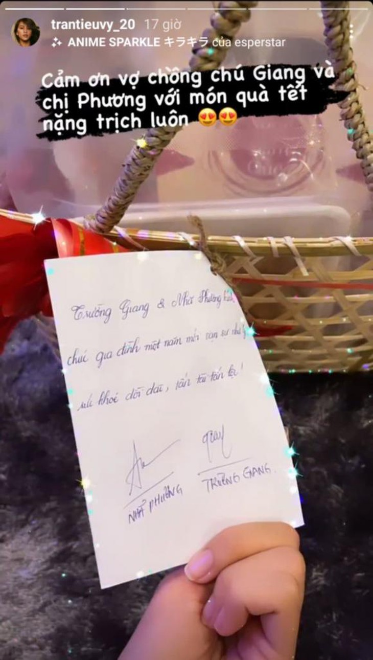 Đó cũng là hành động của hoa hậu Trần Tiểu Vy sau khi nhận quà tết từ đôi vợ chồng Trường Giang - Nhã Phương. Trên trang cá nhân của mình, Hoa hậu Việt Nam 2018 đã chia sẻ hình ảnh món quà này lên của instagram cá nhân.