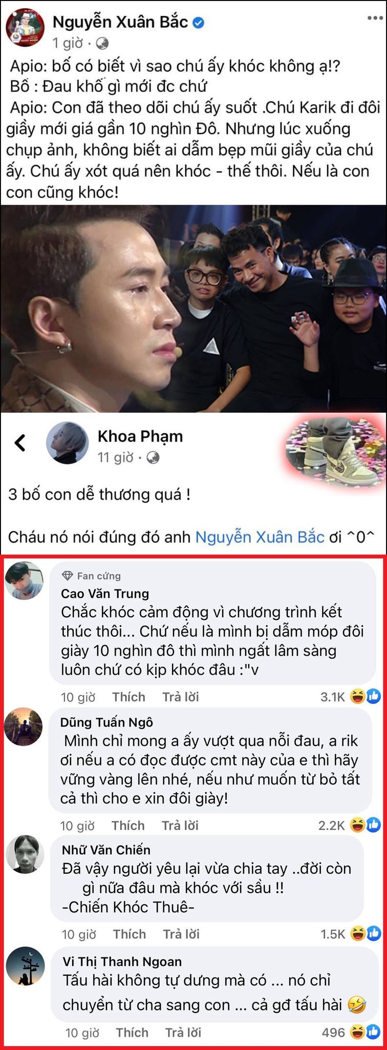 Trong đêm chung kết Rap Việt mùa đầu tiên, Bi Béo - con trai của Xuân Bắc đã lý giải Karik khóc vì bị ai đó đạp vào đôi giày trị giá 10.000 đô la của mình. Liền sau đó, nam rapper đã thẳng thắn "phản pháo" về thắc mắc của cậu bé bằng những từ không thể "cute" hơn.