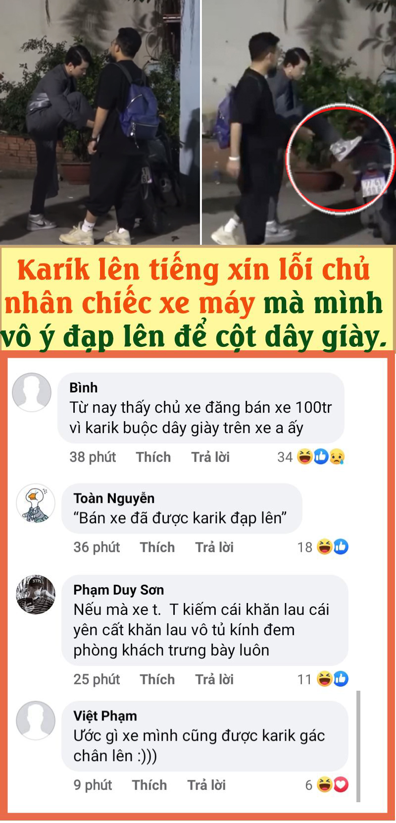 Sau chung kết Rap Việt, Karik đã vô tình gác chân lên chiếc xe máy của người khác để... cột dây giày thay vì cúi xuống. Hình ảnh này khiến nhiều dân mạng "khó chịu". Tuy nhiên, vẫn không ít bình luận hài hước gửi đến Karik hậu "sự cố" này.