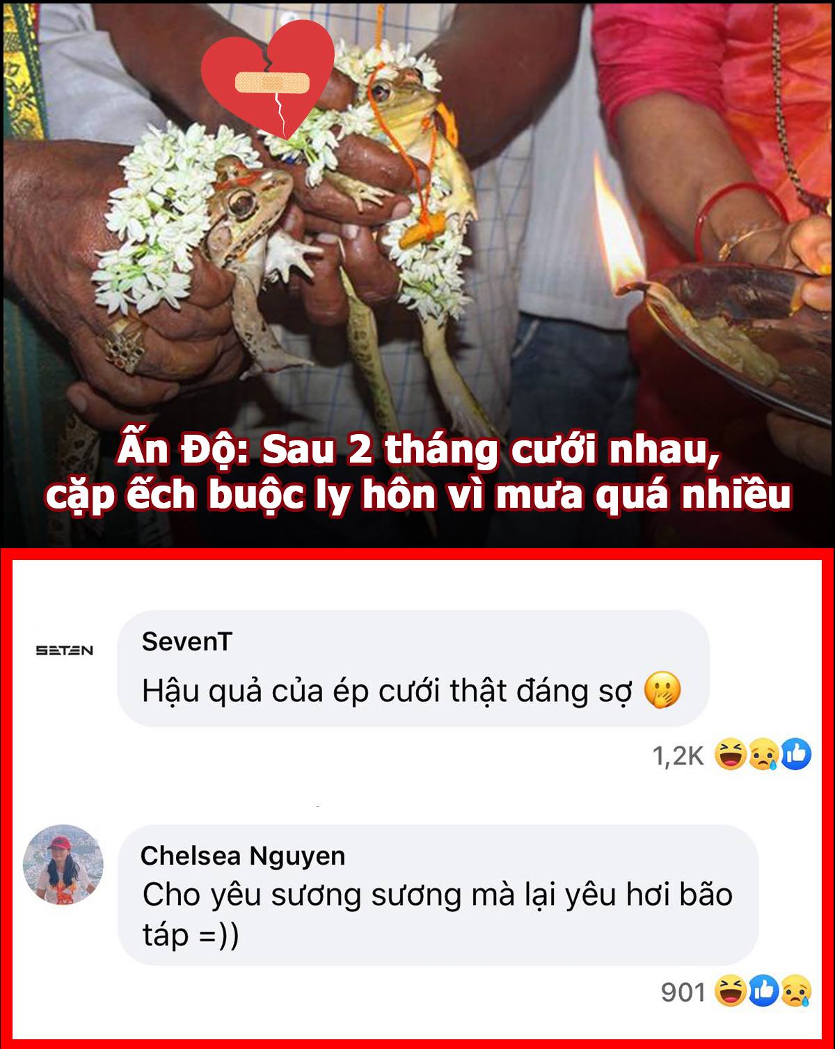 Ngày 19-7, người dân Bhopa ở bang Madhya Pradesh đã tổ chức hôn lễ cho một đôi ếch để nguyện cầu thần mưa Lord Indra đến vì hạn hán kéo dài. Ai ngờ, hai tháng sau đám cưới chấn động này, những trận mưa lớn nhất trong 13 năm qua dội xuống khu vực, khiến lũ lụt hoành hành. Lúc này, đôi ếch bị dân tình kéo ra "tòa" tại đền Turant Mahadev, yêu cầu ly hôn.