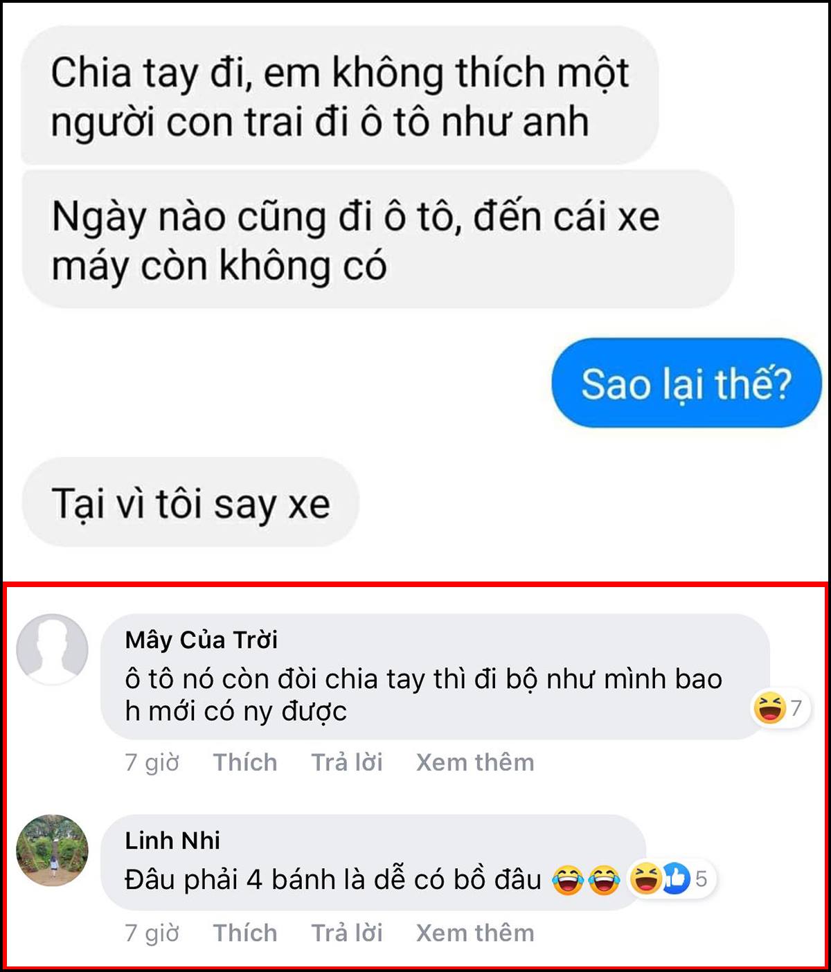 Đúng là chuyện đó đâu ai có thể ngờ. Chàng trai bị "bồ đá" chỉ vì sở hữu xe hơi trong khi xe máy... không có. Xui rủi thay, nàng là cô gái bị "say xe" trong truyền thuyết. Con gái quả là "chúa rắc rối", phải không nhỉ?>> Xem thêm: Vua Còm 1-10: 'Người Việt chừa lại miếng thức ăn cuối cùng vì đó là liêm sỉ'