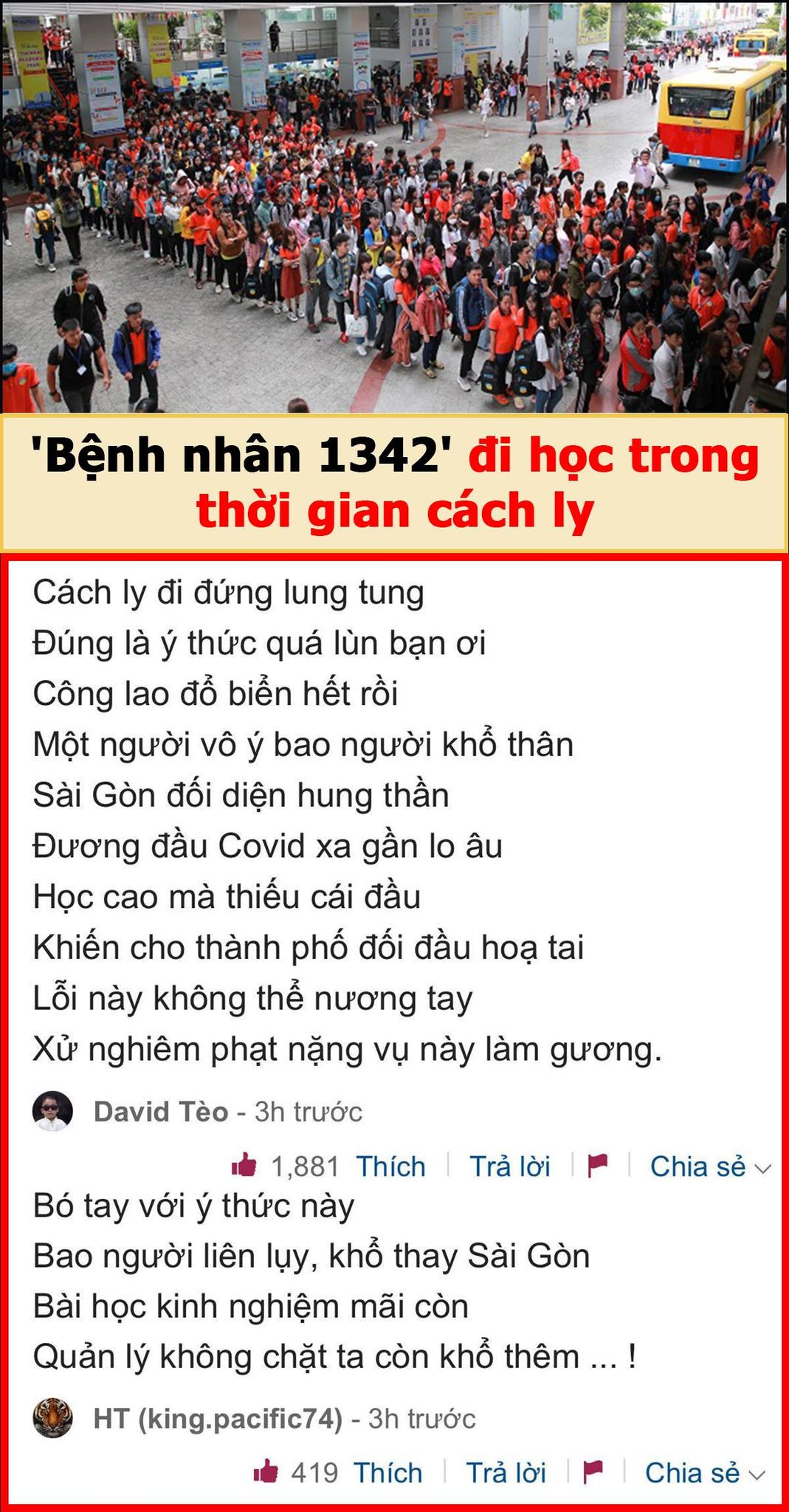 Theo Bộ trưởng Y tế Nguyễn Thanh Long thông tin, "bệnh nhân 1342" trong thời gian cách ly tại nhà đã tự ý bỏ ra ngoài. Cụ thể là đi ăn trưa 21-11 và tới Trường Hutech (Đại học Công nghệ TP.HCM) đi học ngày 22-11. (Comment Vnexpress)