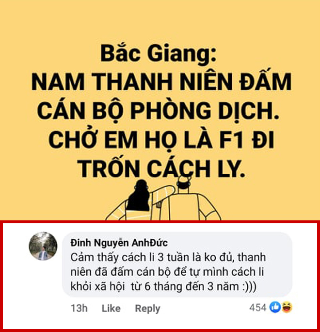 Ngày 19-6, Tổ công tác phòng chống dịch COVID-19 xã Ngọc Sơn (Bắc Giang) đã áp dụng biện pháp cách ly tập trung với trường hợp F1 là anh Âu Văn Khoa (SN 1996), tuy nhiên anh họ là Nguyễn Văn Tưởng (SN 1978) không đồng ý. Anh này cố tình lấy xe chở anh Khoa đi. Khi được yêu cầu hợp tác thì chống đối, thậm chí đấm vào mặt một thành viên tổ công tác. Hiện, anh này đã được tạm giữ hình sự.