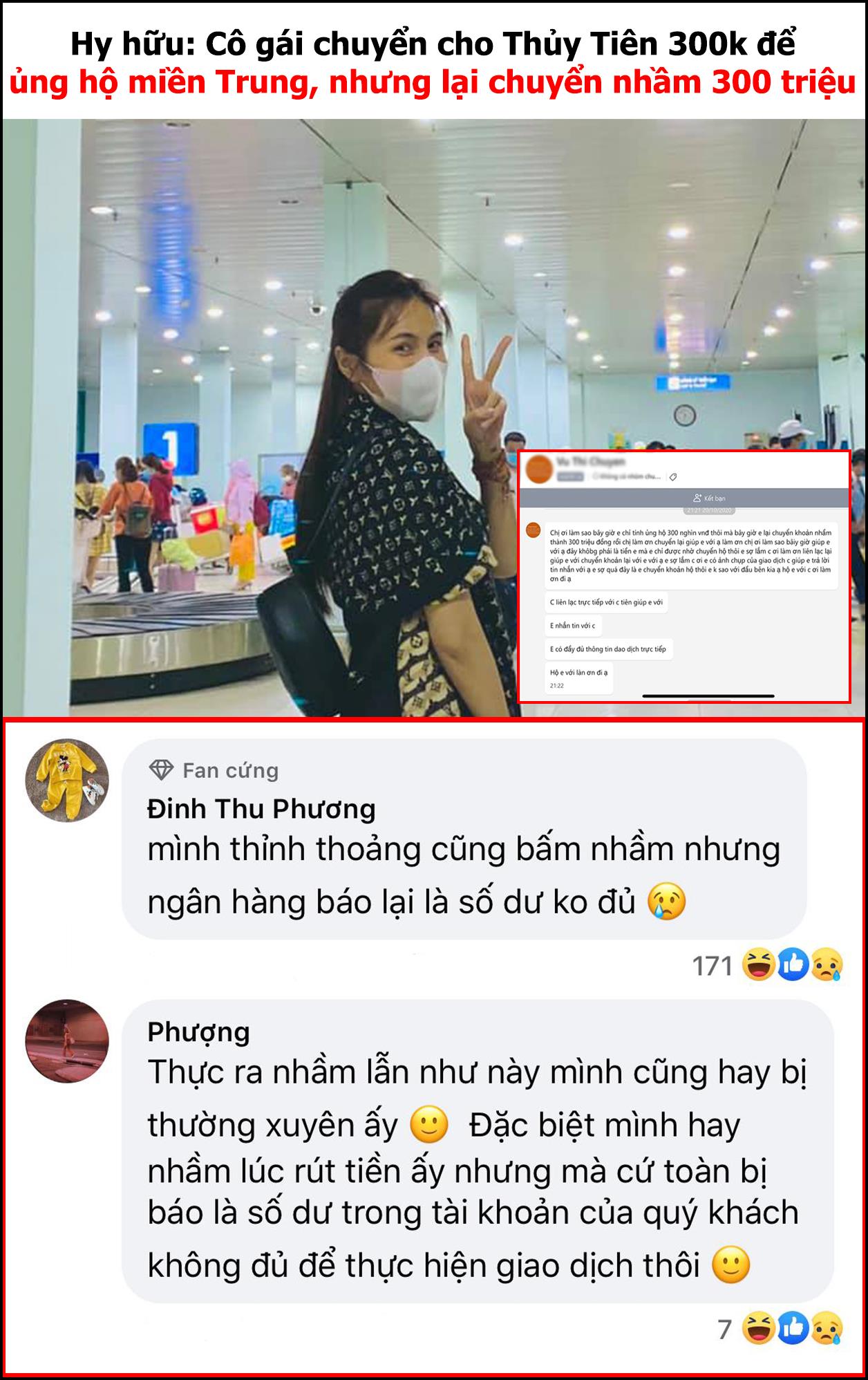 Ủng hộ miền Trung bão lụt 300.000 đồng nhưng cô gái không biết vì lý do gì mà gõ dư ba số "0", thành 300.000.000 đồng, đành phải nhắn tin để xin lại từ nữ ca sĩ. Thủy Tiên cũng cho biết, các bạn chuyển tiền từ thiện cần cẩn trọng hơn nữa nhé!(Xem thêm: Thủy Tiên công khai bản sao kê ngân hàng đợt 1, đã chi hơn 2,6 tỉ)