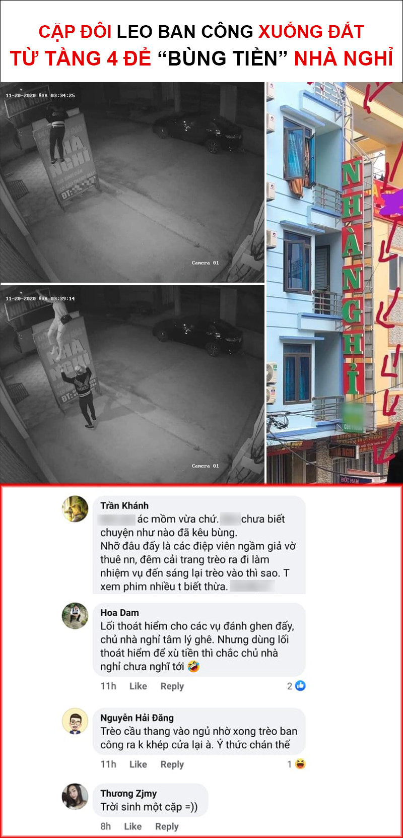 Cặp đôi ở Bắc Giang thuê phòng tầng 4 nhưng vẫn chấp nhận mạo hiểm giữa đêm leo ra ban công nhà nghỉ để bỏ trốn "bùng tiền", mà chẳng biết rằng camera đã ghi lại tất cả.