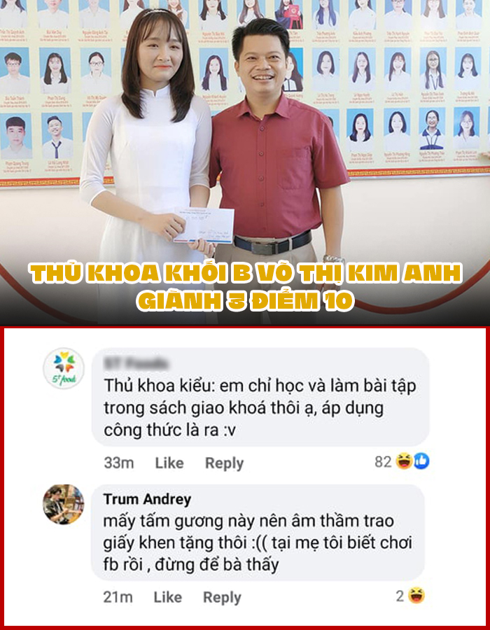 Dân mạng xôn xao, nhất là Gen Z không dám cho mẹ biết về trường hợp thủ khoa khối B Võ Thị Kim Anh. Nữ sinh Hà Tĩnh này đã đạt được 3 điểm 10 ở các môn Toán, Hoá, Sinh.