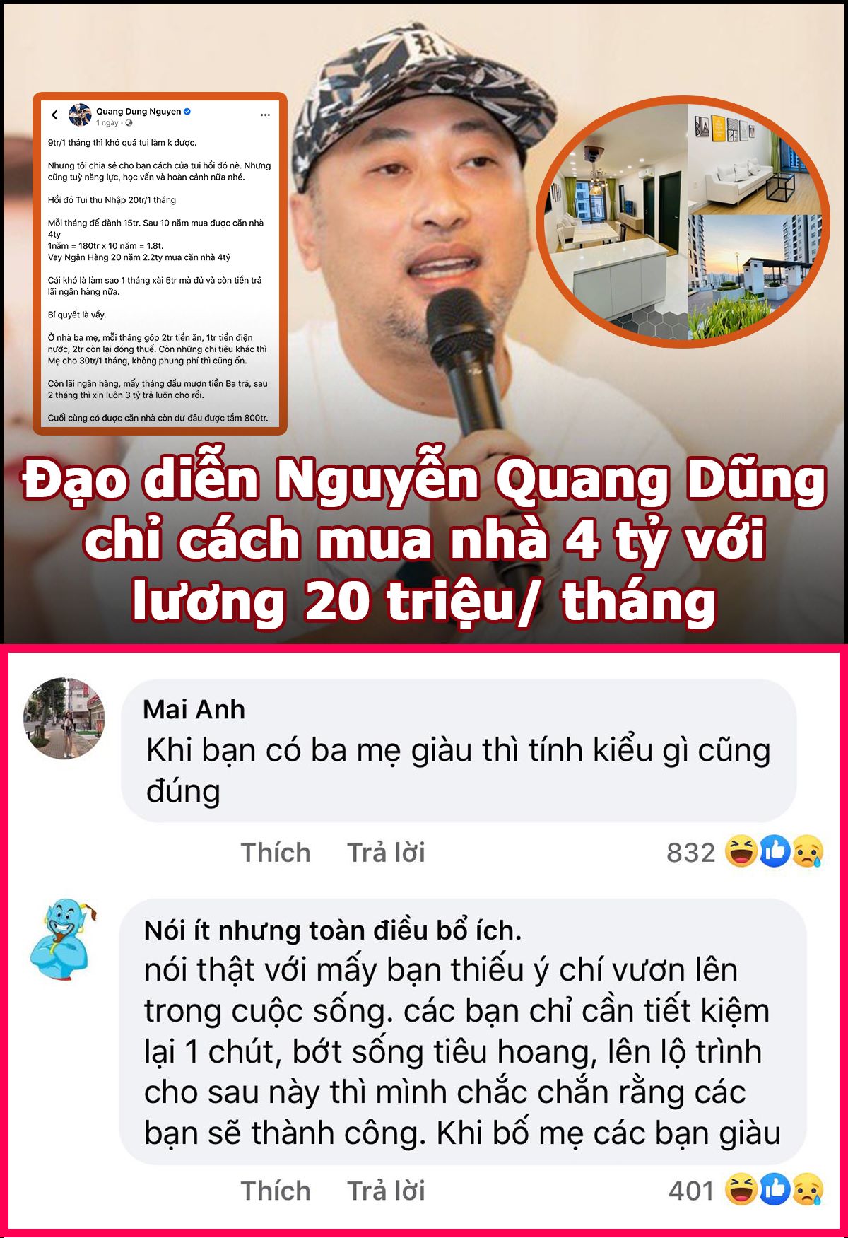 Đạo diễn "Dũng khùng" chia sẻ về câu chuyện mua nhà với mức lương 9 triệu/tháng quá khó đối với anh. Tuy nhiên, nếu thu nhập ở mức 20 triệu/tháng thì hoàn toàn nằm trong tầm tay nếu... cha mẹ giàu.